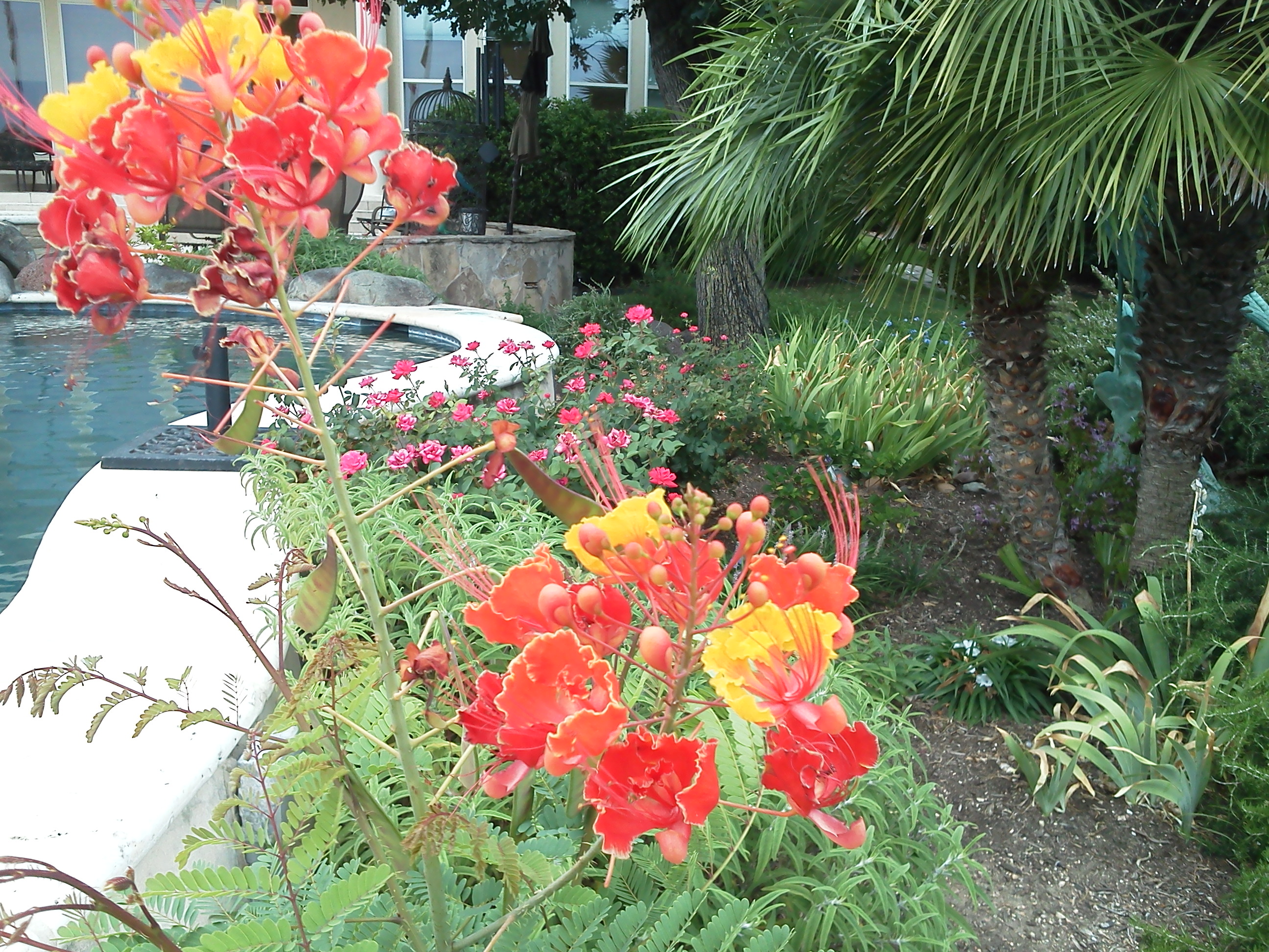 Poolside Pride of Barbados overlooking bed Roses