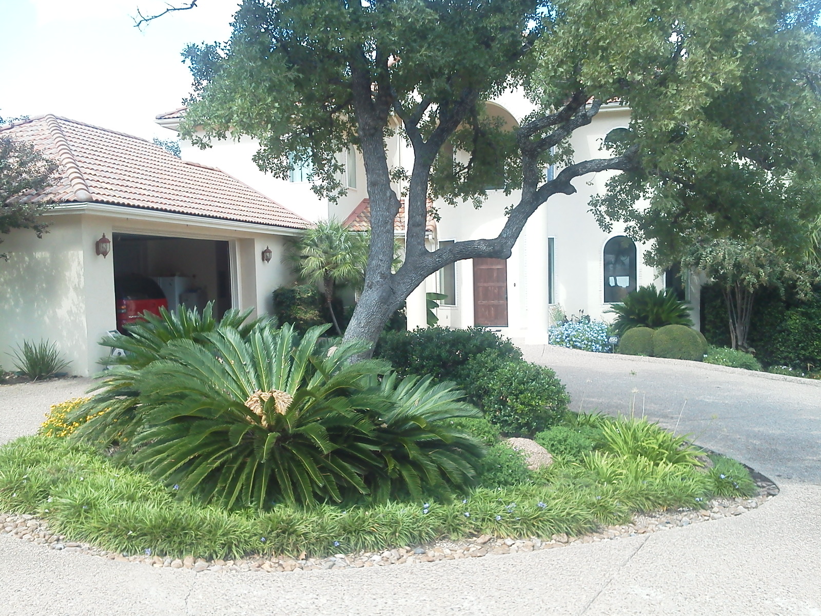 Island Bed of Mexican Petunias surrounding Live Oak and Sago Palms