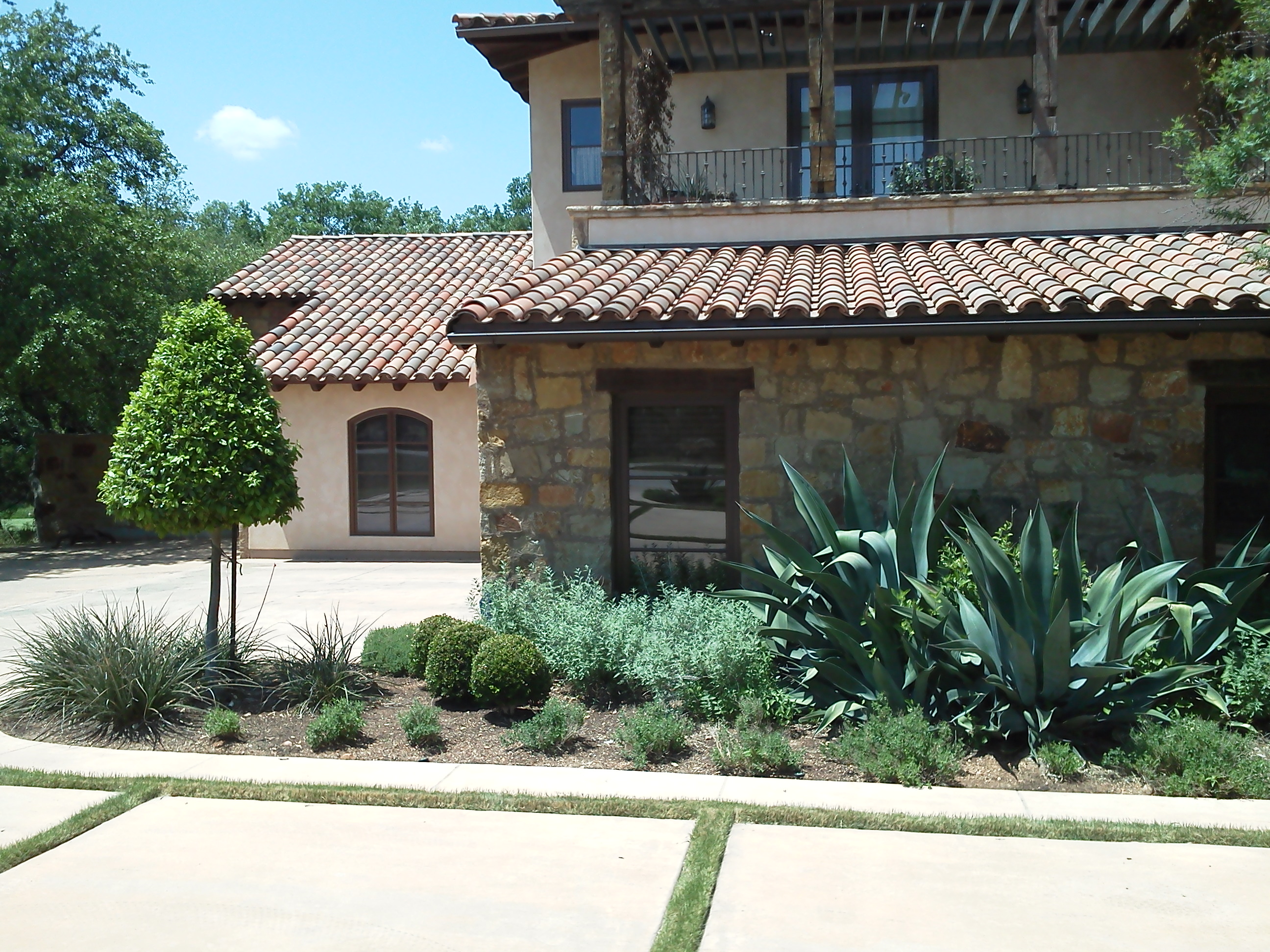 Driveway entrance with Large Agave Cacti, Boxwood Hedges, and Salvia Gregii